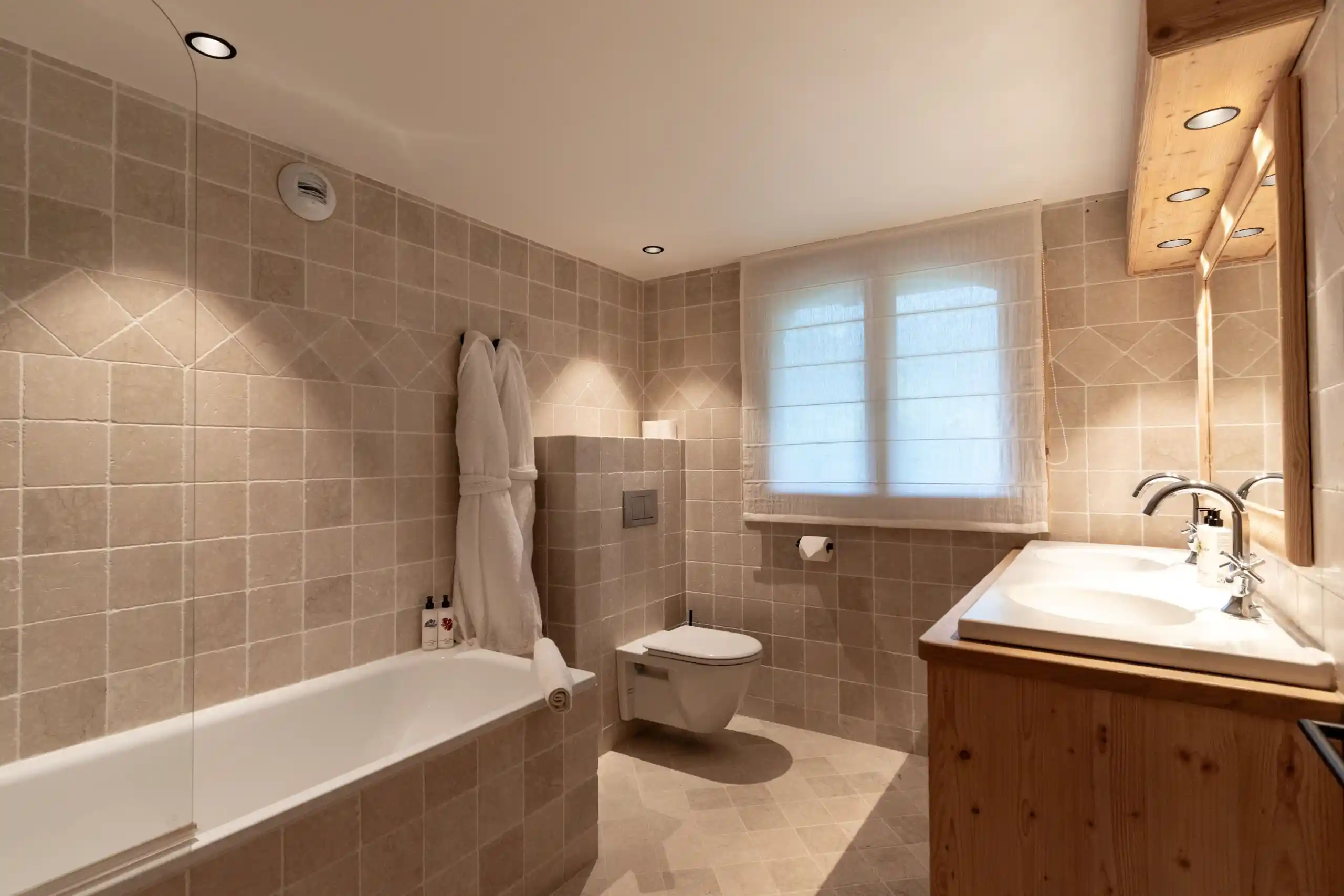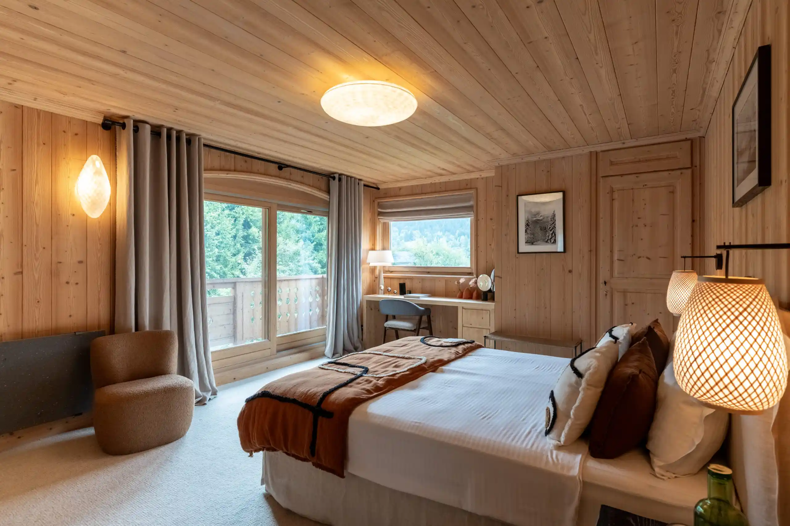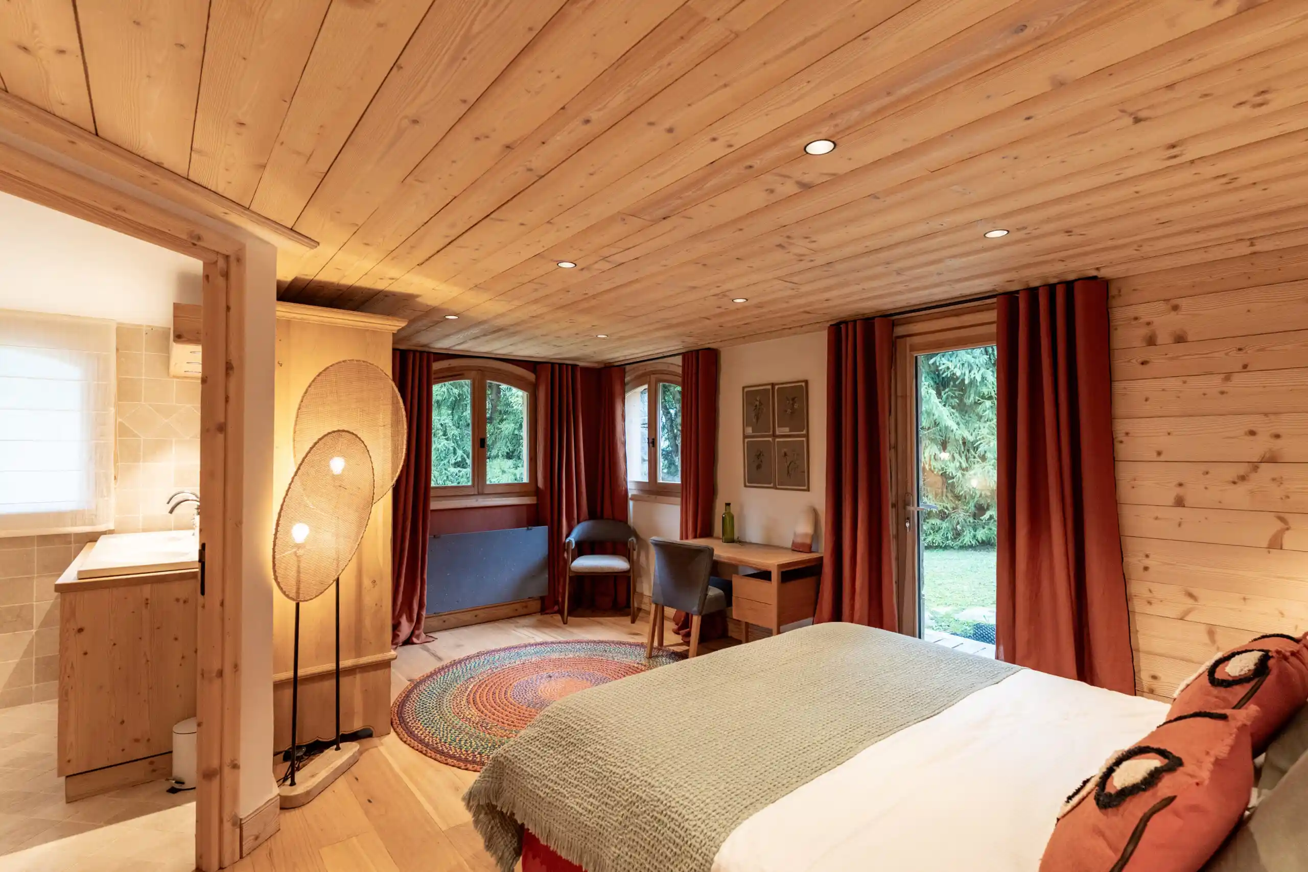 Each of the five-bedroom has been individually styled to reflect a contemporary alpine theme. Neutral tones, high-quality linens, and bespoke furnishings create a calming retreat. All bedrooms feature en-suite facilities & private balconies, offering guests quiet moments with views across the valley. Beds can be arranged as king-size doubles or twins for total flexibility. Bedroom 6 is an additional children’s bedroom with two single beds.
