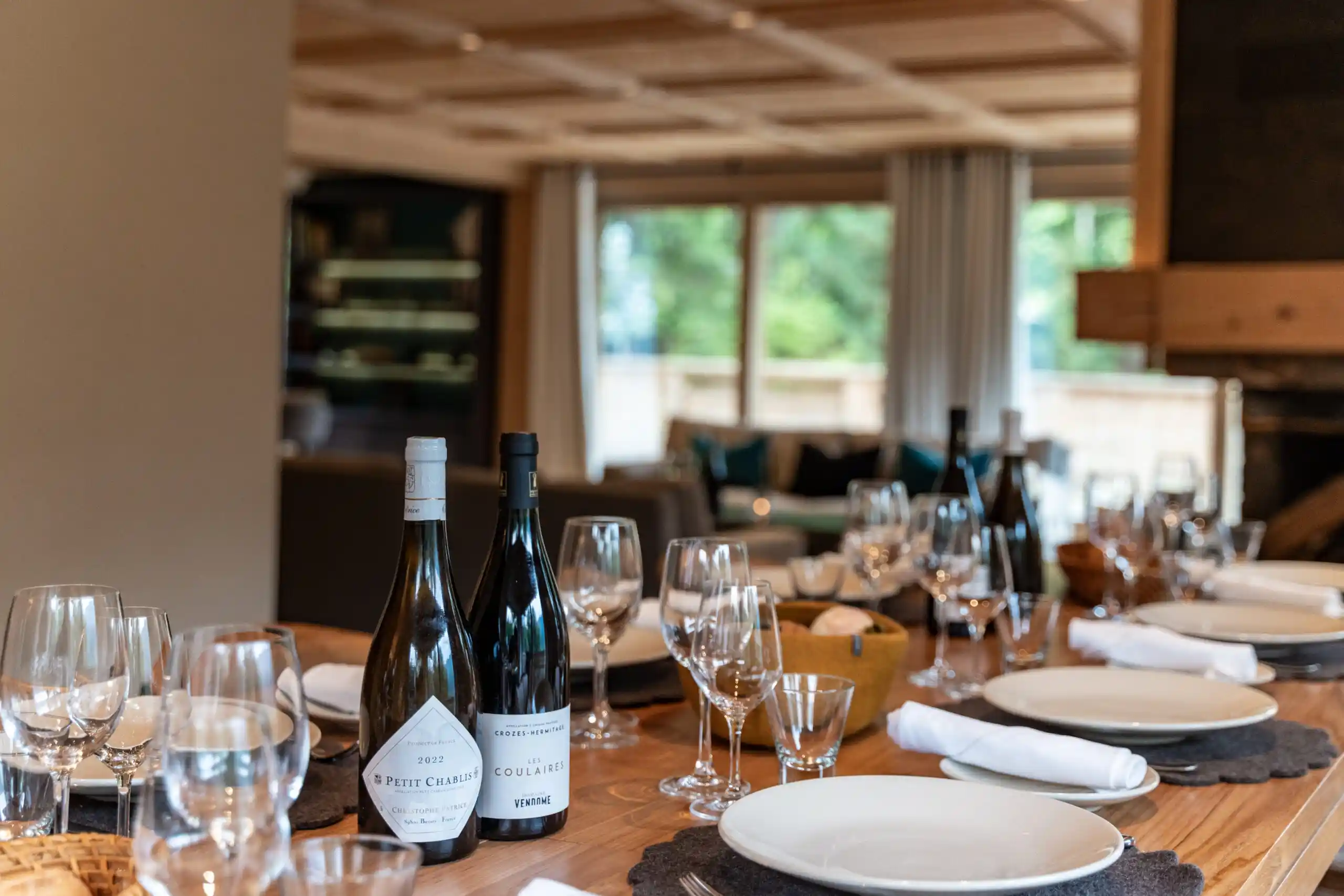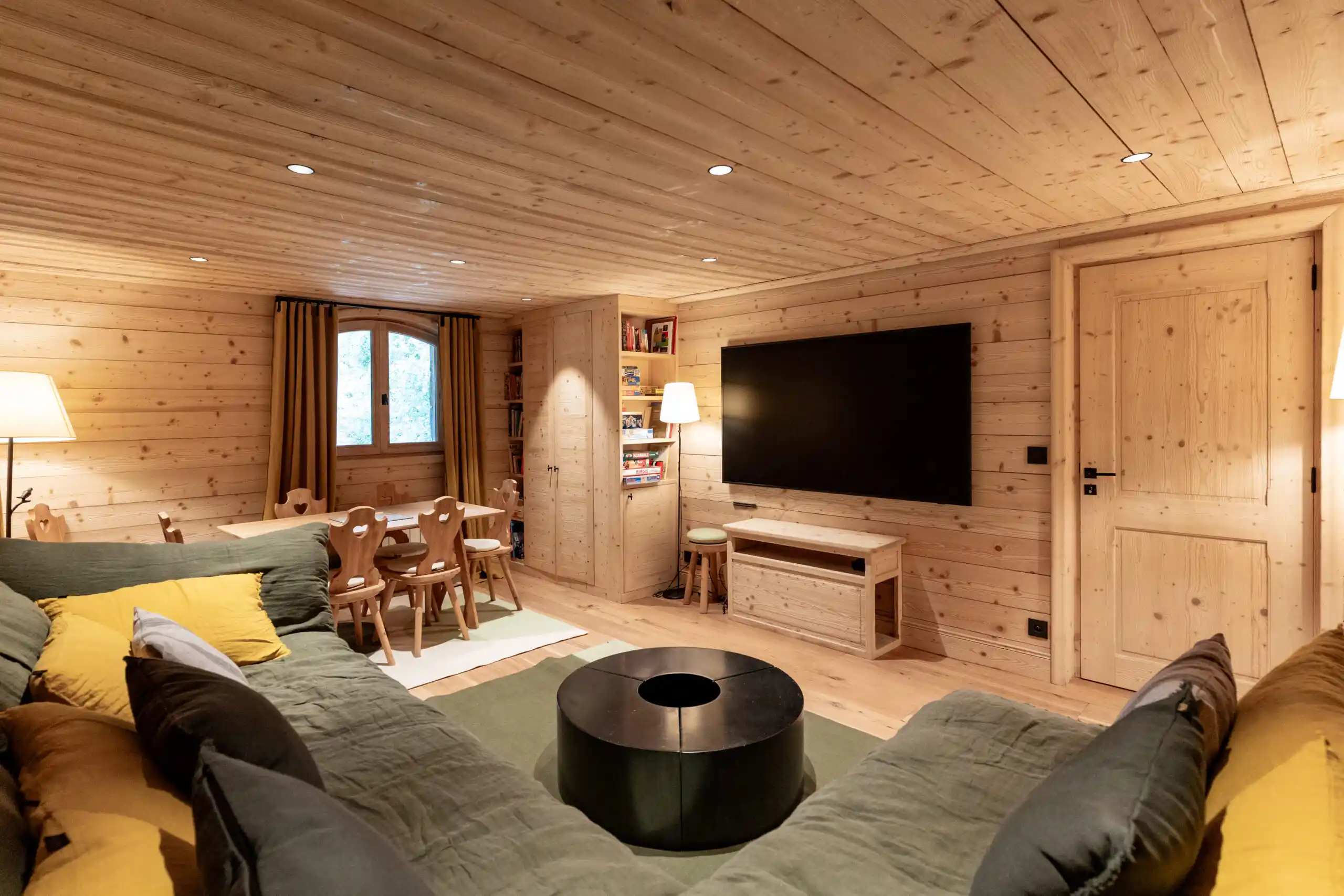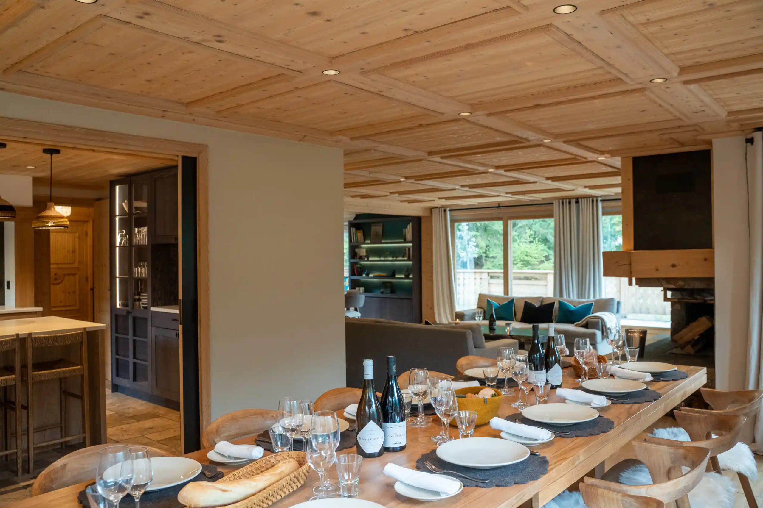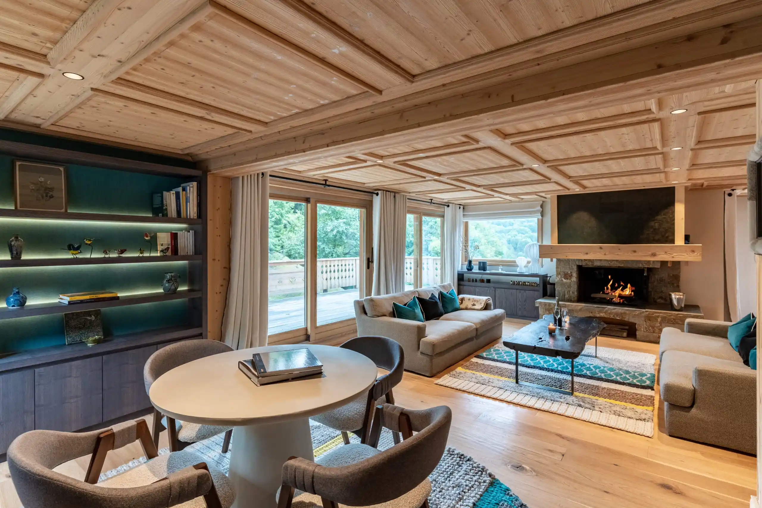 The heart of Chalet Bellevue is its breathtaking open plan living and dining area. Designed with a modern alpine aesthetic, the space combines natural materials — warm woods, stone accents, and soft textiles — with contemporary furnishings and elegant statement pieces. The ornately carved wooden ceiling and floor-to-ceiling windows flood the room with natural light, creating a bright and inviting atmosphere.