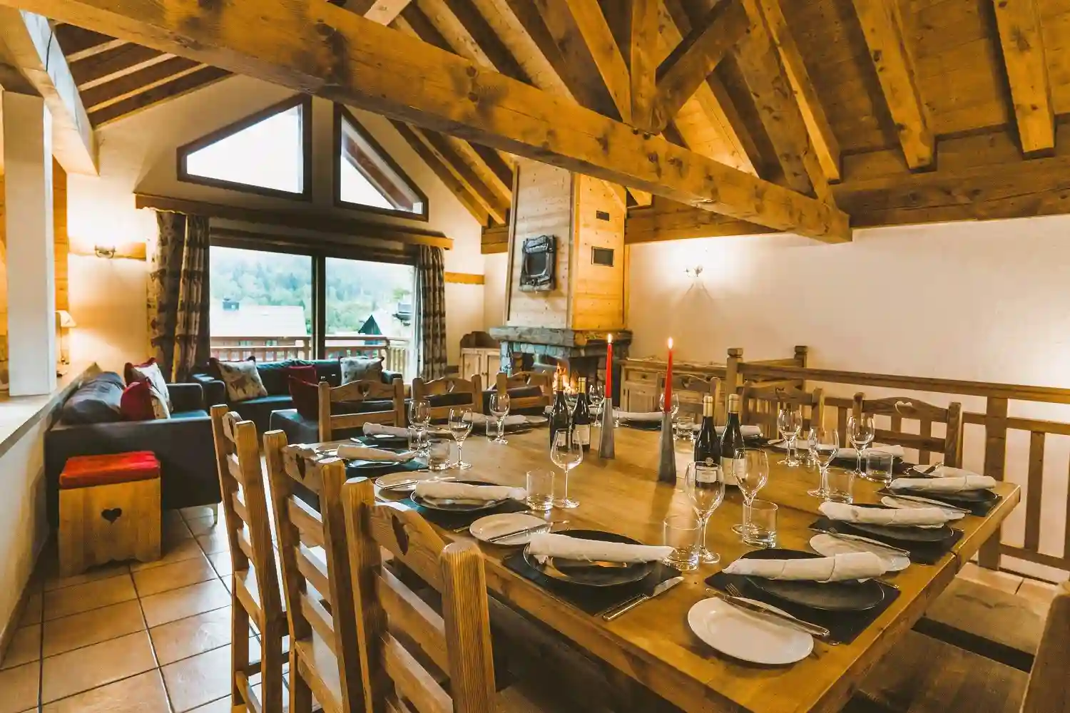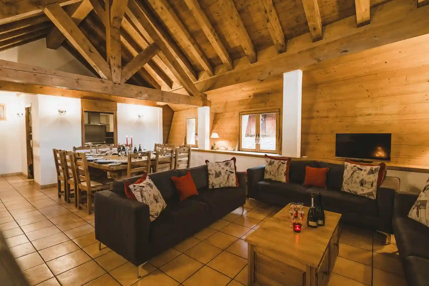 The heart of the chalet is its open plan living and dining area, complete with a roaring log fire, comfy sofas, and a large sunny balcony with breathtaking views of the Tougnète and Saulire peaks. Whether you’re unwinding with a glass of wine after a day on the slopes or gathering for a gourmet dinner, the atmosphere is always warm and welcoming.